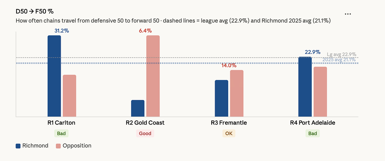 For some reason I’m obsessed with this stat. D50-to-F50 percentage measures how often ball movement travels from defensive 50 all the way to forward 50. It’s the most direct measure of whether the handbrake is off or on.
