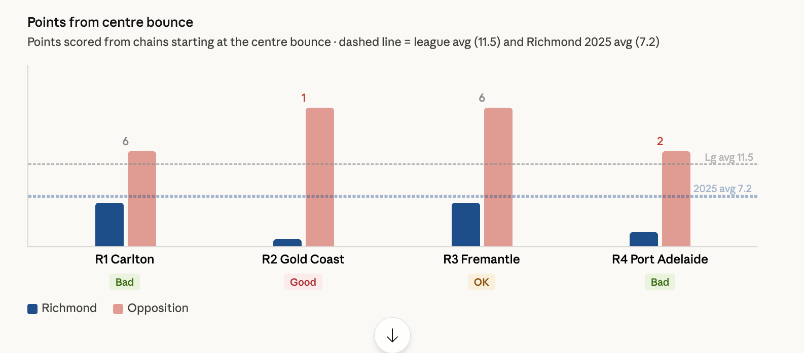 Contrasting with Gold Coast and our old gaffer is even more uncomfortable. The Suns are averaging 19.7 points from centre bounce across their first three games, nearly five times Richmond’s output. In round two specifically: Gold Coast 19, Richmond 1. We aren’t good enough to be giving teams a three-goal start from one stat.