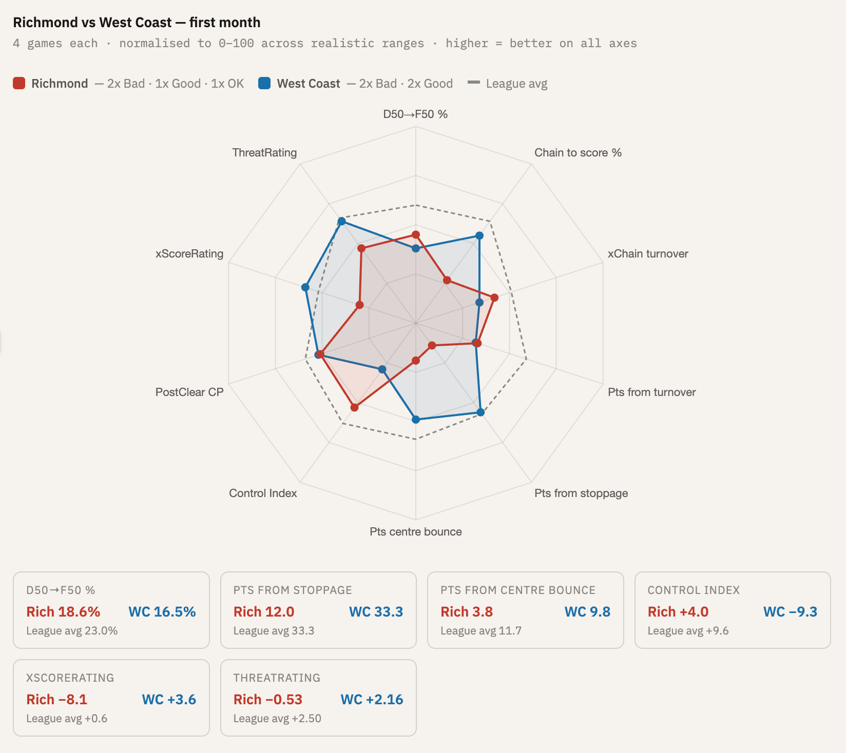 I’ve also set up a table tracking our game style against West Coast which is serving up some really interesting points of comparison that I’ll unpack in the next couple of weeks and track over the season.