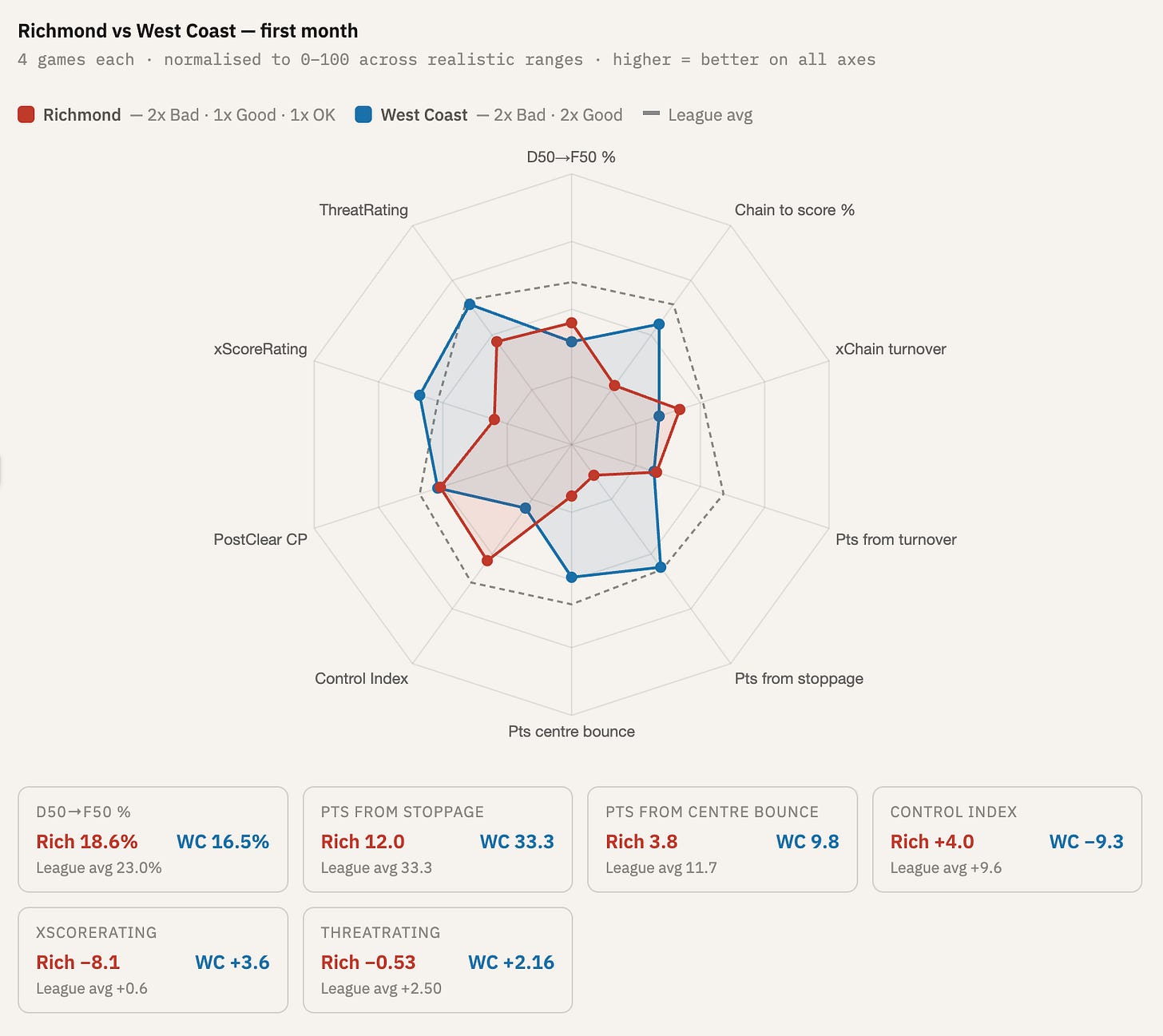 What’s interesting is that 2025 didn’t show this pattern, the transition numbers were flat across all opponent tiers. Richmond played essentially the same game against everyone. The tier split emerging in 2026 after just four games is actually the shape the handbrake theory predicts, whether it holds as the season goes who could tell, but the early signal is more encouraging than it might seem while watching the actual football.